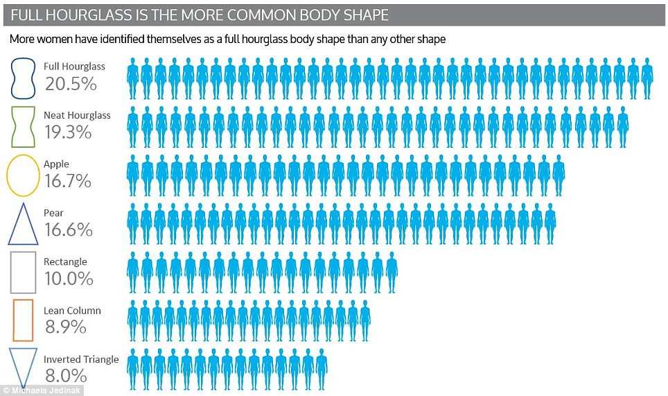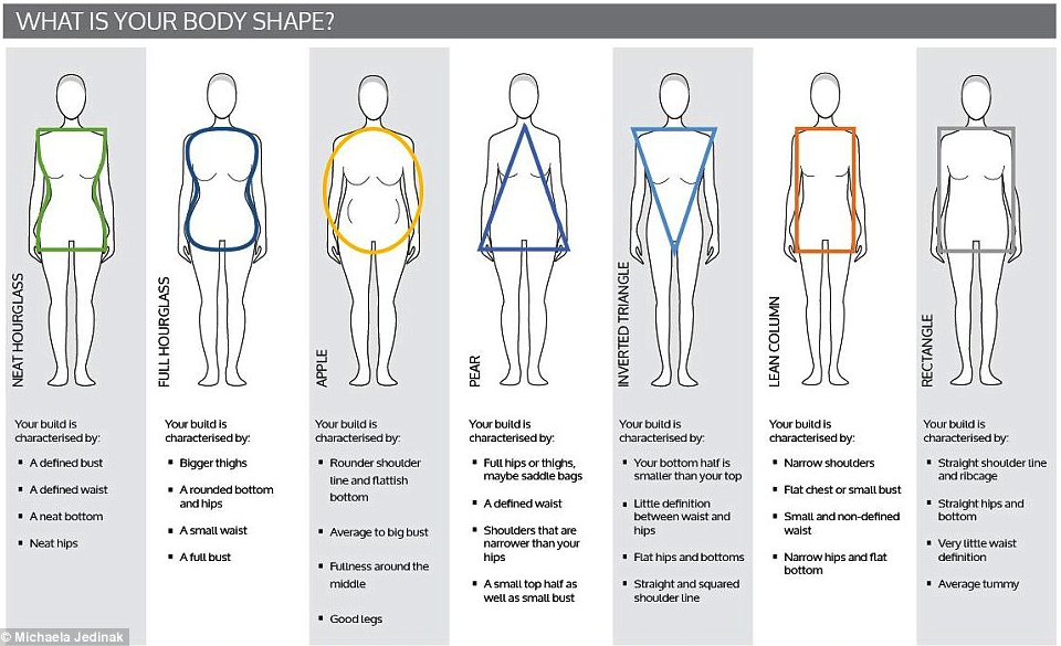 A British study published in the Daily Mail surveyed 18,000 women and found the majority think they have a “full hourglass” shape (think Christina Hendricks) followed by a “neat hourglass” (like Scarlett Johansson), and then an “apple-shaped” body (similar to Oprah Winfrey.) The remaining four most common shapes are pear, rectangle, lean column and inverted triangle.