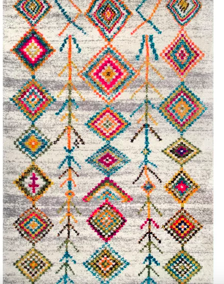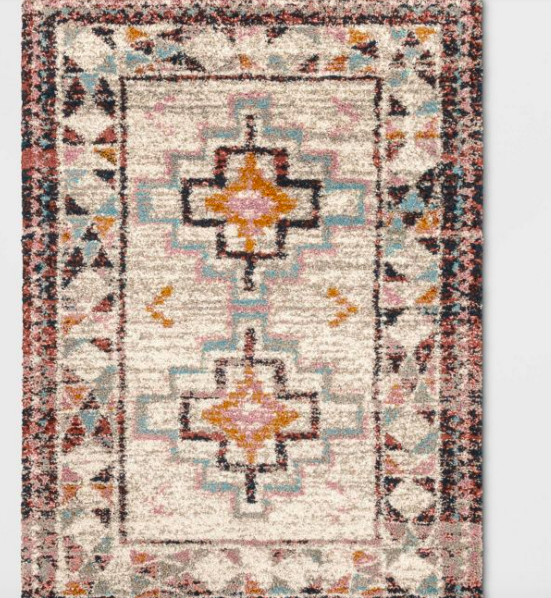 Rugs that have a neutral-colored background and a bright pop of color in the stitching are perfect for accentuating the boho style. Pair this one with a tan leather sofa and a cozy throw blanket; you’ll never want to leave your cozy abode. It could work well as a fun bohemian kitchen rug under a midcentury modern dining table.