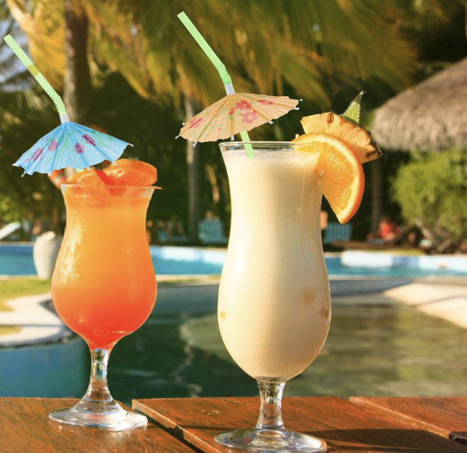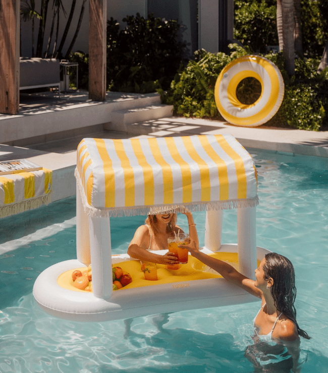 Adding inflatable floating food and drink trays is an easy way to make your pool party feel like a vacation getaway. “Bring that vacation mode feel with inflatable floating food and drink trays. “Guests love this, as it adds color and goodies so they don’t need to leave the pool,” Jervis-Hill adds. “Fun elements such as parasol straws and cabana stripe pool towels matching your theme can also add some fun to your decor.”