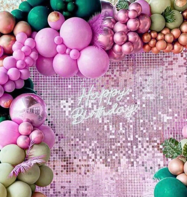 “A couple of things I love and are easy for DIY is to create a grass wall with a fun neon sign attached to it with wire ties, it’s really easy to do and creates a fun welcome for guests,” says Jervis-Hill. “Balloons or flowers can be added to bring in the color. If the budget is tight, foil fringe curtains can replace the grass wall for a quarter of the price, and it still brings in that fun element.”