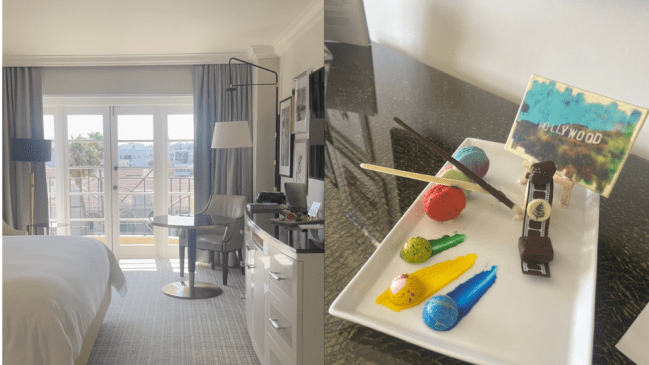 The lobby was grand, brimming with polished marble, and full of fresh flowers and greenery. Our room was immaculate, which included a plush king bed, a decked out bathroom, and a sweeping view of Beverly Hills that reminded me why people fall in love with this city. There were also a few welcoming touches that instantly made me feel cared for, like a plate of chocolatey treats served with the dreamiest presentation, plenty of BYREDO Gypsy Water bath products, and an actual vanity with its own chair. This room was designed to make you feel as comfortable and chic as humanly possible. Even some of the most luxurious hotels tend to skimp on at least one aspect of the experience, but the Four Seasons finds a way to deliver on all counts; that much was clear.
