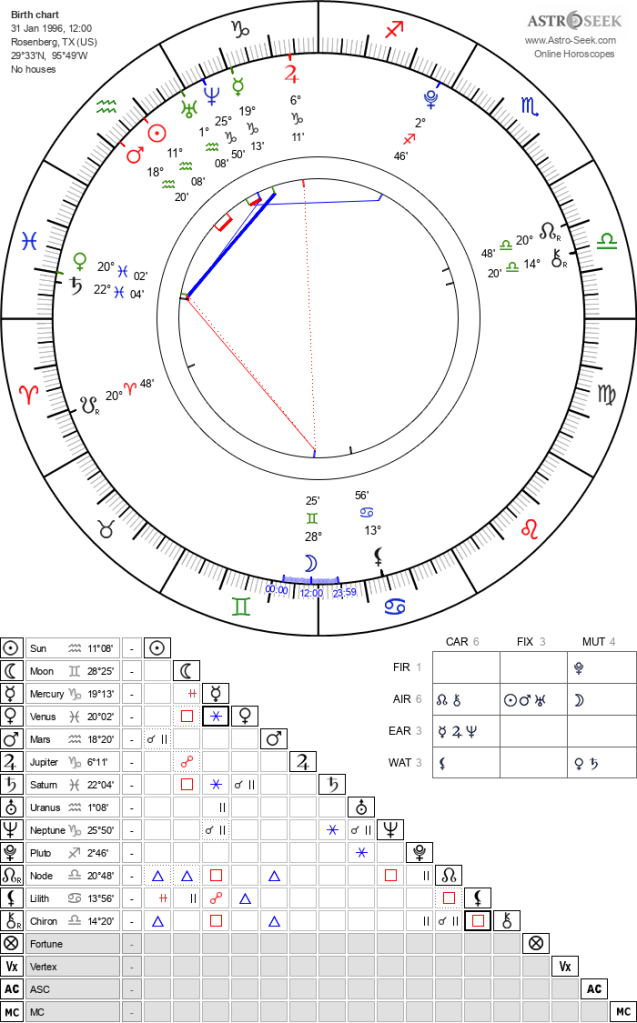 Devin’s birth chart is calculated based on his birthday, January 31, 1996, and his hometown Rosenberg, Texas as his birthplace. Unfortunately, I was unable to find Devin’s time of birth. Although I’m missing his time of birth, I can still use Devin’s birthday and birthplace to create his birth chart. However, it will miss one crucial piece of evidence—his ascendant, a.k.a. the rising sign. Even though this is unknown, the majority of Devin’s placements can be determined.