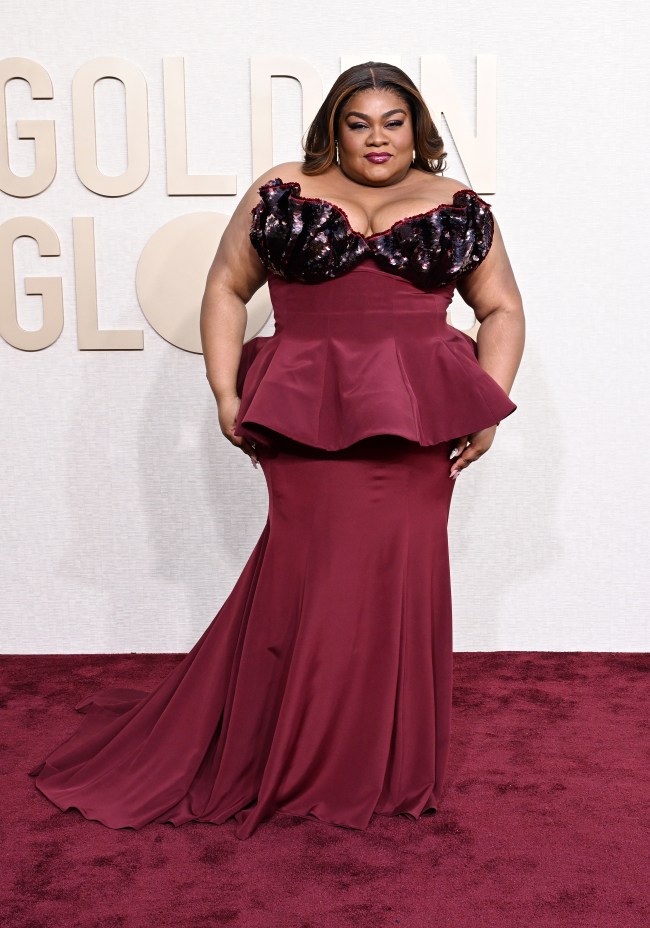 Nominee Da’Vine Joy Randolph matches the red carpet with a sumptuous, on-trend peplum gown by Rodarte. She’s nominated for Best Performance by a Female Actor in a Supporting Role in any Motion Picture for her work in “The Holdovers.”