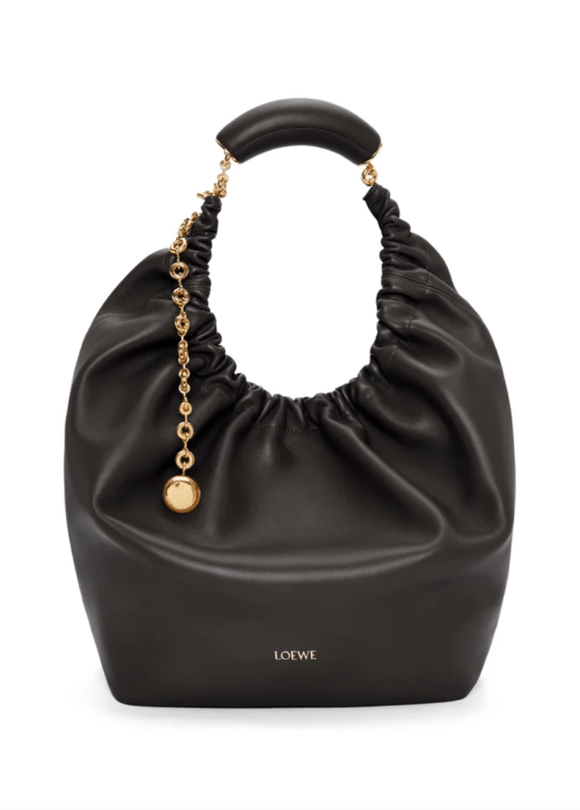 The Squeeze Bag is a part of Loewe’s Fall/Winter ‘23 collection. It is made with soft, buttery lambskin leather and gets its namesake from its squishy squeeze handle. The bag hangs on a gold donut-style chain which can be adjusted to carry the bag crossbody, as a shoulder bag, or as a handheld accessory. Color choices include oat, olive, black, and burgundy.