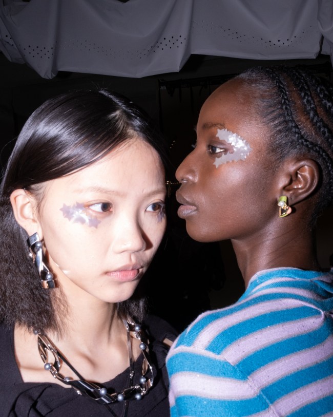 The cool neutrals of the Earth Star collection make these patches an amazing beauty accessory that doesn’t necessarily stand out or scream “skincare.” It belongs perfectly with graphic makeup or bleached eyebrows. In the photo above, a model at the most recent New York Fashion Week’s new favorite brand LUAR by designer Raul Lopez wears two brown stars underneath her eyes. At the most recent Paris Fashion Week, London-based designer Kiko Kostadinov sent models down the runway wearing stacked patches for a glowy halo effect around the eyes and cheeks, as seen in the photo below..