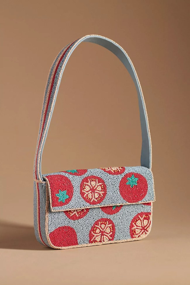 The Anthropologie bag comes in three different collections, including the Produce Edition, which features their version of the now sold-out version of STAUD’s tomato print beaded bag as well as an adorable olive print style. Anthropologie’s version also includes a Bloom Edition with three different flora prints and a Flora Edition, which features different beading techniques and is slightly more expensive (but still under $100).
