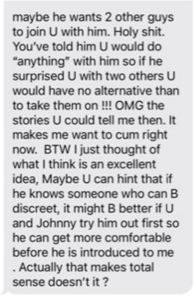 McMahon texted Grant, “Do U promise to make me proud Baby? Will U show him what a Porno Star U can B. Will U Show Off for me like never before ????” and “On days when he’s in town, I want him to fuck U every morning and later In the office too.”