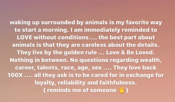 “Happy Sunday from me & 2 stinky dogs,” the “Don’t Call Me Angel” collaborator wrote in the post. “Waking up surrounded by animals is my favorite way to start a morning. I am immediately reminded to LOVE without conditions…. the best part about animals is that they are careless about the details. They live by the golden rule … Love & Be Loved. Nothing in between. No questions regarding wealth, career, talents, race, age, sex ….They love back 100X …. all they ask for is to be cared for in exchange for loyalty, reliability, and faithfulness. (reminds me of someone).”