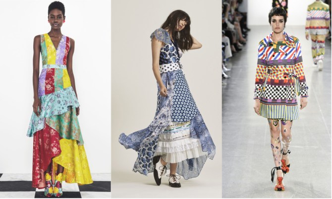 Why keep things simple with one print when you can have a buffet of patterns, instead? Alice + Olivia (left) is known for their intricate and perfectly executed patchwork pieces, and DVF (center) is the queen of unique must-have dresses season after season. Even Libertine (right) got in on the trend, taking a more graphic approach with shapes and stripes.