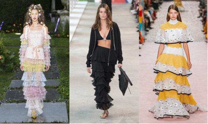 Ruffles resurfaced on the fashion radar a couple seasons ago, and we’re living for these maximalist takes on the motif. Rodarte (left) made our ruffle dreams come true with one stunning multicolor gown, and Michael Kors (center) introduced us to our new favorite spring skirt.