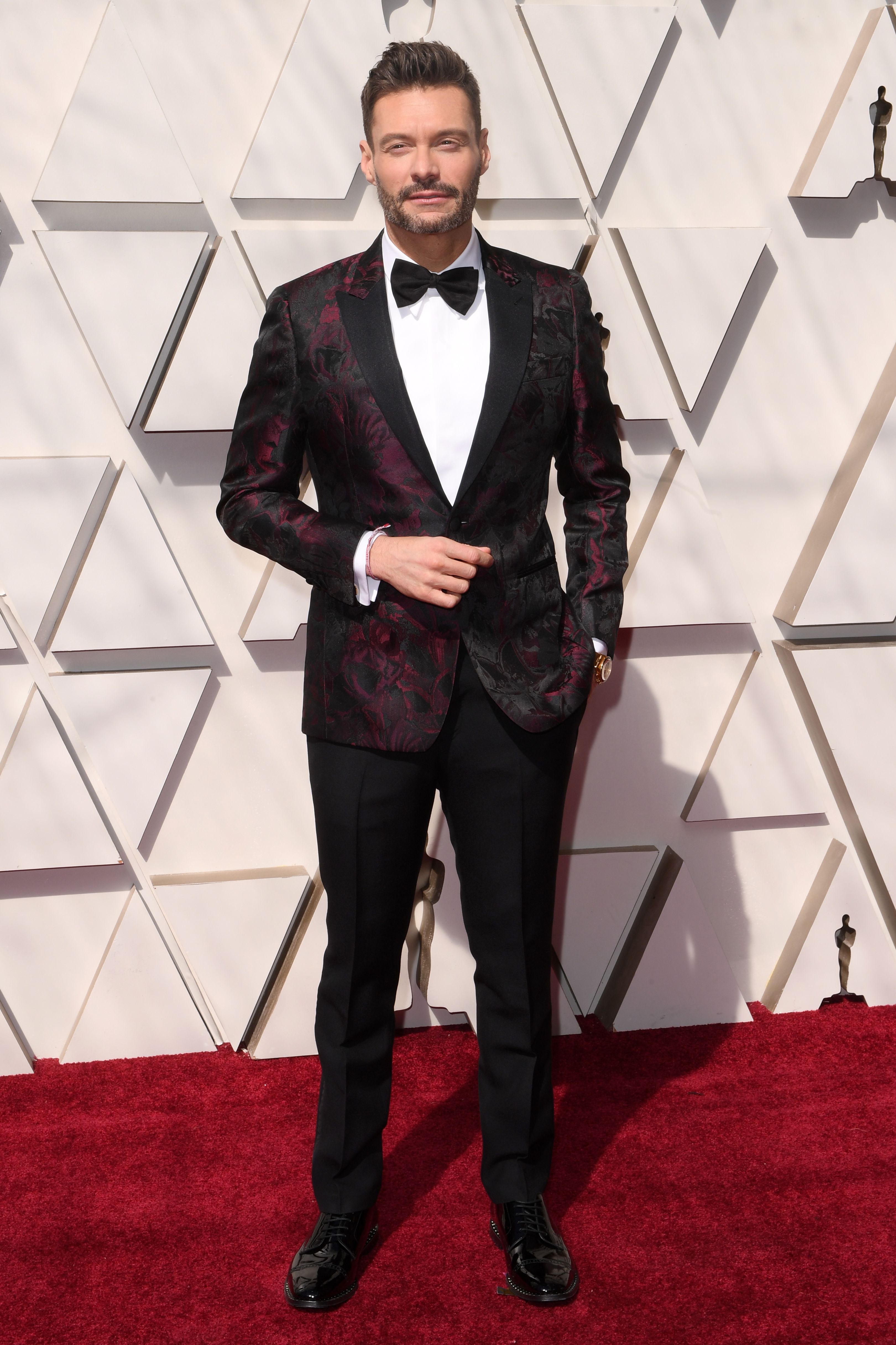 Ryan Seacrest, who always looks super chic, stunned again in a red and black tuxedo.