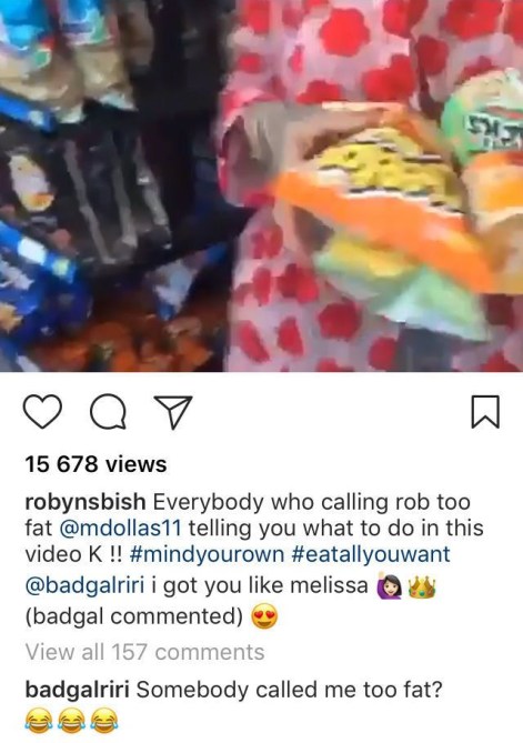 In the video caption, the fan mentioned that body-shamers were comparing Rihanna’s recent thicker body to Rob Kardashian‘s weight gain. She advised them to take Rihanna’s friend’s advice and mind their own business “Everybody who calling rob too fat @mdollas11 telling you what to do in this video K !! #mindyourown#eatallyouwant @badgalriri i got you like melissa 🙋🏻👑” the fan wrote.