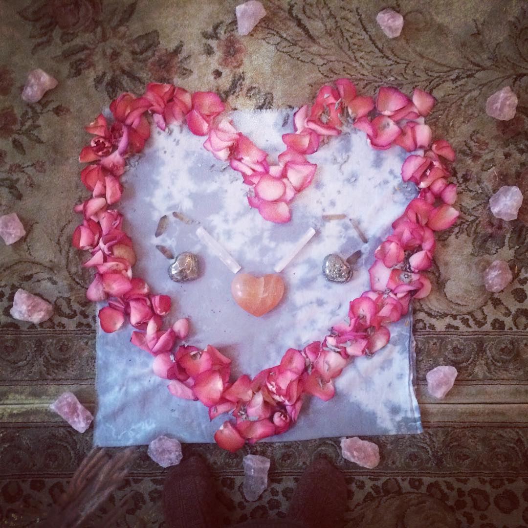 Place one rose quartz on your womb and another rose quartz on your chest between your throat and heart center. Hold a third piece of rose quartz in your left hand.