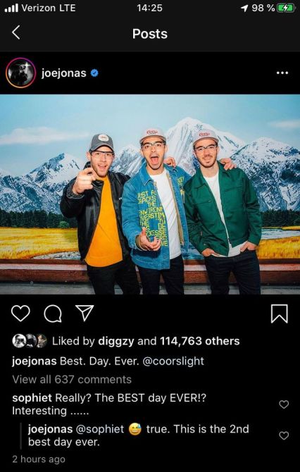 Now, Sophie has turned her sights on her musician hubby, Joe Jonas. On Instagram–Joe posted a photo of himself and his brother Nick and Kevin Jonas with Coors Light. he tagged the photo– “Best. Day. Ever,” with Coors Light. Sophie of course slyly commented back saying, “Really? The BEST day EVER!? Interesting…..” LOL. Though Joe Joe’s retort won’t go down in the Ryan Reynolds clapback hall of fame–he did give a smooth effort in his response.