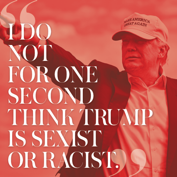 According to all of the women I spoke to—several of whom have been featured by the female pro-Trump Twitter account @babesfortrump—Trump’s demeaning comments about women do not reflect how he actually feels about them. “Actions speak louder than words,” says Ashley, 32, a stay-at-home mom from Massachusetts. “His own daughter, Ivanka, is independently successful, educated, and professional. That doesn’t happen if your father is sexist. Trump pays his female employees on the same pay scale and in some cases even higher than men. I think he misspeaks sometimes, but I do not for one second think he is sexist or racist.”