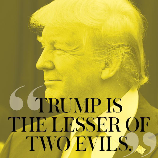 For some women, that reason alone is enough. In fact, Corey says that’s the main reason she’s voting for him. “I don’t agree with everything he says, and a lot of it I have problems with, but my concerns about Trump in no way come close to my concerns about Hillary,” she says. “For me, it’s about choosing the lesser of the two evils in an uninspiring election cycle. That’s Trump.”